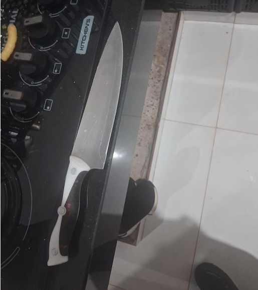 Durante o episódio, a mulher foi agredida fisicamente com empurrões, além de ter o pescoço e os braços segurados com força. A situação se agravou quando o autor, segundo relato da vítima, sacou uma arma branca da cintura e ameaçou matá-la, afirmando que o caso só terminaria “com ele preso ou ambos mortos”.