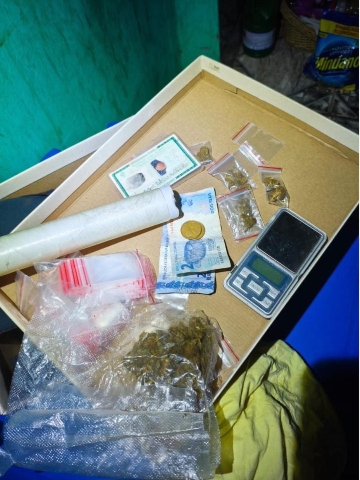 Com a autorização da mãe do jovem, os policiais realizaram buscas na residência, onde encontraram um pé de maconha plantado em um jarro, quatro porções da droga prontas para venda, embalagens plásticas, uma balança de precisão e uma quantia em dinheiro.